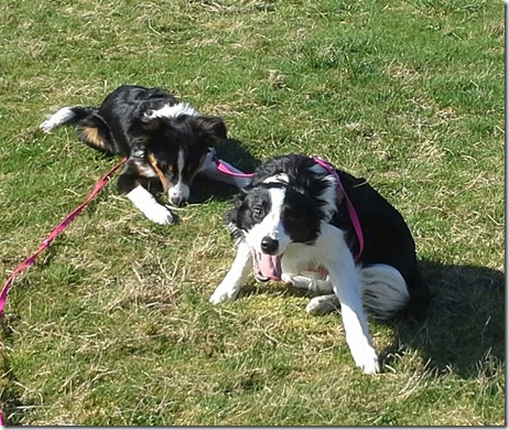 At home Hops played in the yard with the boys and we practiced recalls and distance downs. He did a great job with the recalls and the downs, even downing when my back was turned and I was talking to another dog! Then I put the boys away, tried to play fetch with Hops with a frisbee, and discovered that the frisbee supposedly has different rules than the ball. The ball he brings right back, the frisbee he keeps for himself! So I put him on a long leash and helped him come back when called, he got the idea right away and started bringing the frisbee back to me. Good puppy!