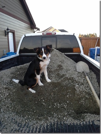 Later Jeremiah was using the wheelbarrow in the yard to move gravel and when it was empty he offered Hops a ride. Hops had no fear of riding in it and in fact, from then on he asked to ride in it whenever it was empty. Fun puppy!